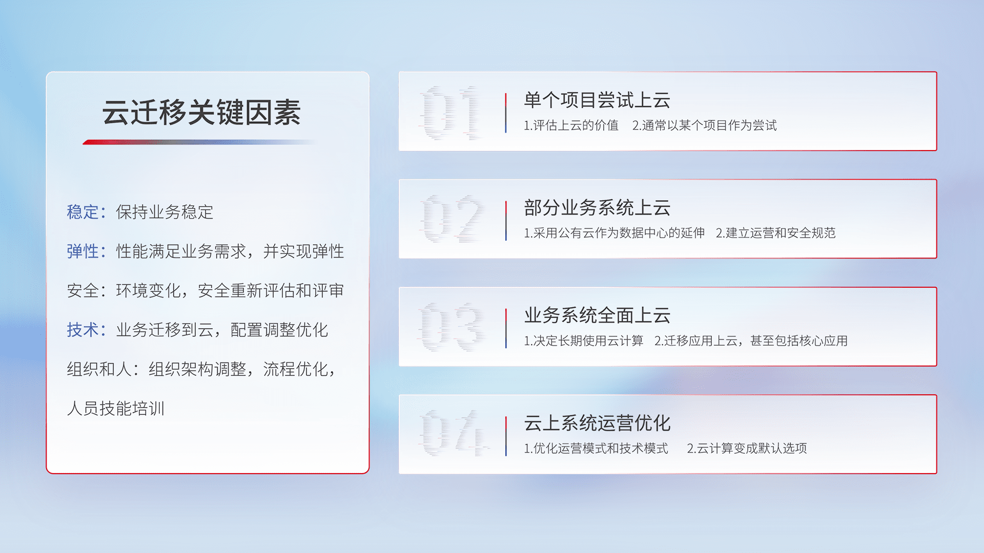 结合实际业务,,,从规划设计、、云平台选型、、、云原生改造、、、数据迁移、、、集成交付,,,迁移全过程为客户识别最佳上云路径,,做好风险识别管理,,,,设计网络架构、、身份权限、、、、安全审计合规、、、操作审计、、、、日志审计、、、监控告警策略、、、多站点容灾设计等,,,,对云上基础设施进行整体规划,,提升IT治理水平,,,,以满足弹性、、高可用、、、、高性能的需求。。。。