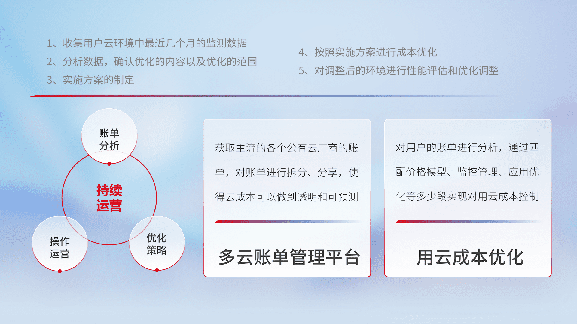 通过多云纳管,,,以统一的资源数据模型把客户的云资源进行抽象和封装,,,,进而实现对多云资源的统一操作,,保障云资源管理的可靠性、、、、稳定性与可用性。。量身定制化运维内容,,,配置、、开发运维、、、补丁管理、、备份、、监控、、、认证和访问管理、、审计和日常巡检等,,,,保障在用云过程中的可靠度,,,稳定度以及高可用率。。。。